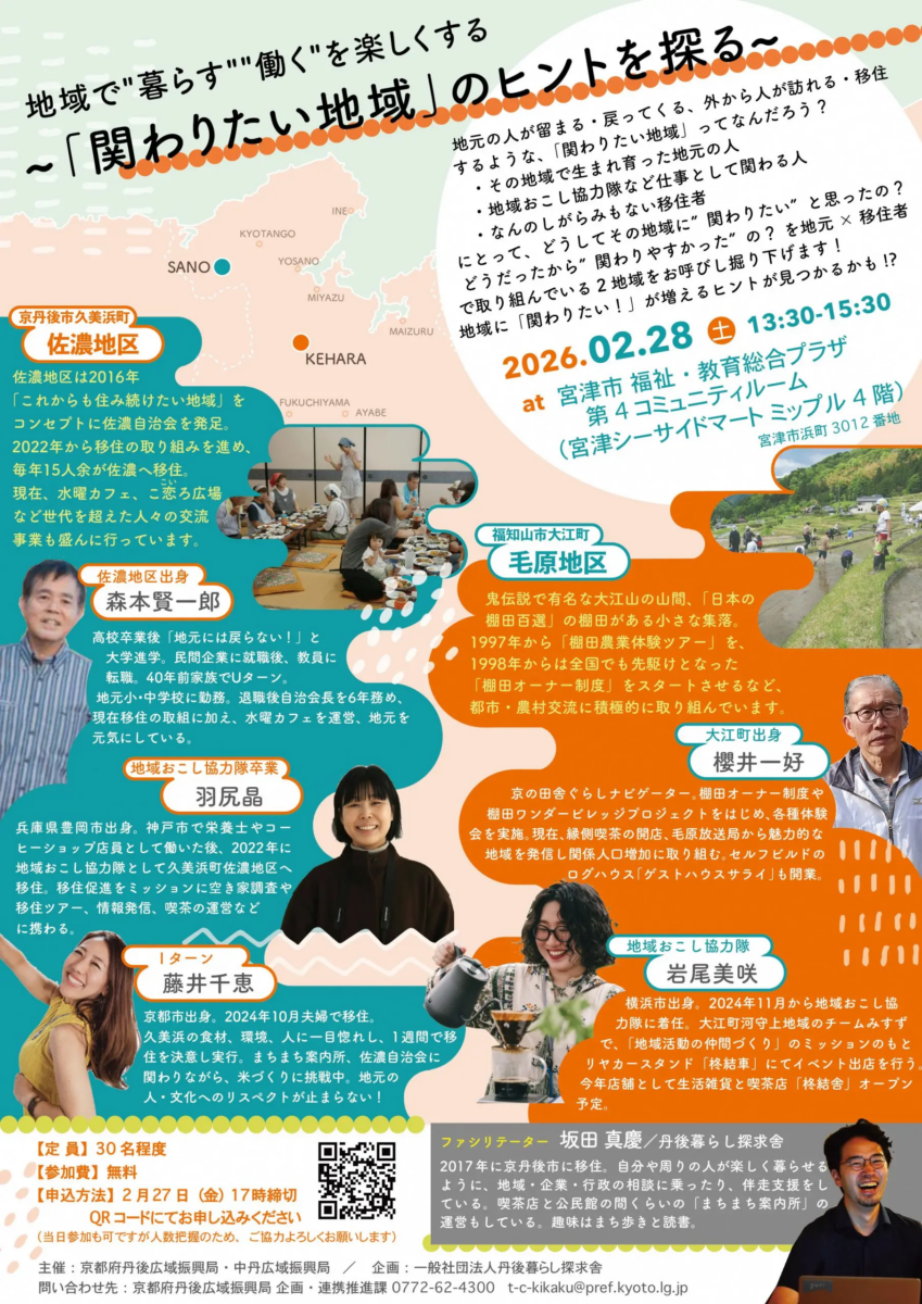 にとって、どうしてその地域に”関わりたい”と思ったの? どうだったから”関わりやすかった”の? を地元×移住者で取り組んでいる2地域《京丹後市久美浜町佐濃地区》、《福知山市大江町毛原地区》をお呼びし掘り下げます!